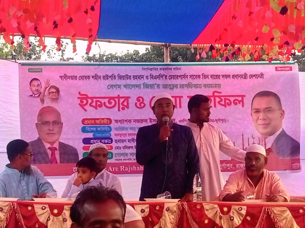 রবিউল ইসলামঃ রাজশাহীর দুর্গাপুর উপজেলার বখতিয়ারপুর স্কুল মাঠে এক বিশাল ইফতার ও দোয়া মাহফিল অনুষ্ঠিত হয়েছে। ইউনিয়ন ছাত্রদল ও বিএনপির সকল সহযোগী অঙ্গ সংগঠনের যৌথ উদ্যোগে আয়োজিত এই অনুষ্ঠানে প্রয়াত দেশনেত্রী বেগম খালেদা জিয়া এবং মরহুম আরাফাত রহমান কোকোর আত্মার মাগফিরাত কামনা করা হয়।