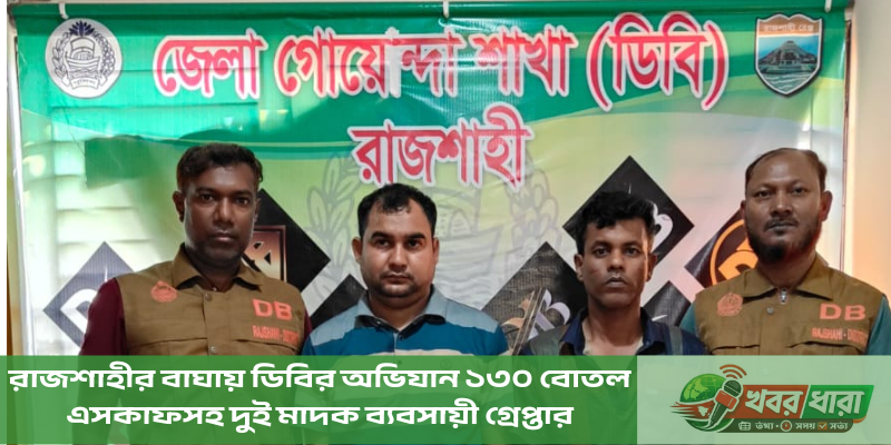 রাজশাহী জেলা গোয়েন্দা শাখা (ডিবি) পুলিশ অভিযান চালিয়ে বাঘা থানা এলাকা থেকে ১৩০ বোতল নিষিদ্ধ কোডিনযুক্ত মাদকদ্রব্য ‘এসকাফ’ (ESkuf) উদ্ধারসহ দুই চিহ্নিত মাদক ব্যবসায়ীকে গ্রেপ্তার করেছে। শনিবার (৪ এপ্রিল, ২০২৬) ভোরে বাঘা থানাধীন আলাইপুর মধ্যপাড়া গ্রাম থেকে তাদের হাতে-নাতে গ্রেপ্তার করা হয়।